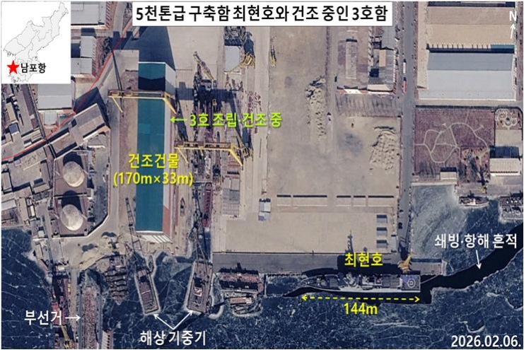 북한은 2025년부터 5000톤급 신형 구축함을 건조하고, 처음 공개하기 시작했다. 최근 위성사진을 살펴보면, 아직 완전한 실전 전력이라고 보기는 어려운 상태이다. 1번함 최현호와 2번함 강건호 모두 진수 이후에도 바다로 나가 활동하는 모습이 거의 없고, 항구에 계속 머물거나 예인선에 의해 이동하는 장면이 포착됐다.